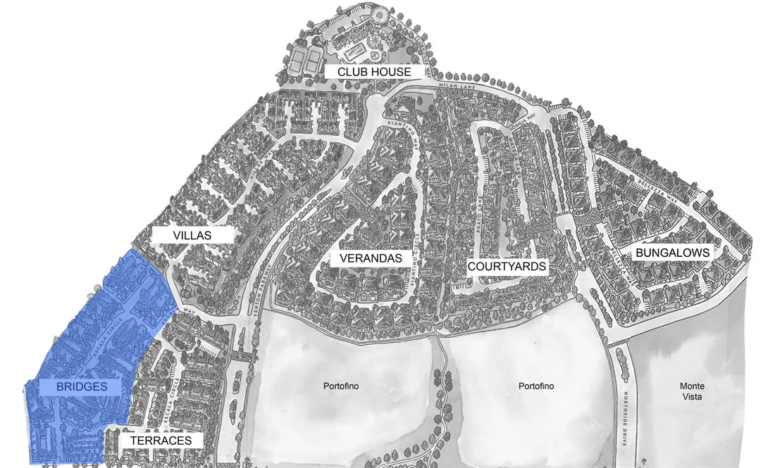 In the far southwest section of Escala, you will find the tri-level rowhomes of the Bridges with landscaping surrounding each building. and some with greenbelt views. Each home offers a two-car garage concealed in the central motor court. There are four different floorplans to choose from including 2 or 3 bedrooms with 2.5 or 3.5 baths.