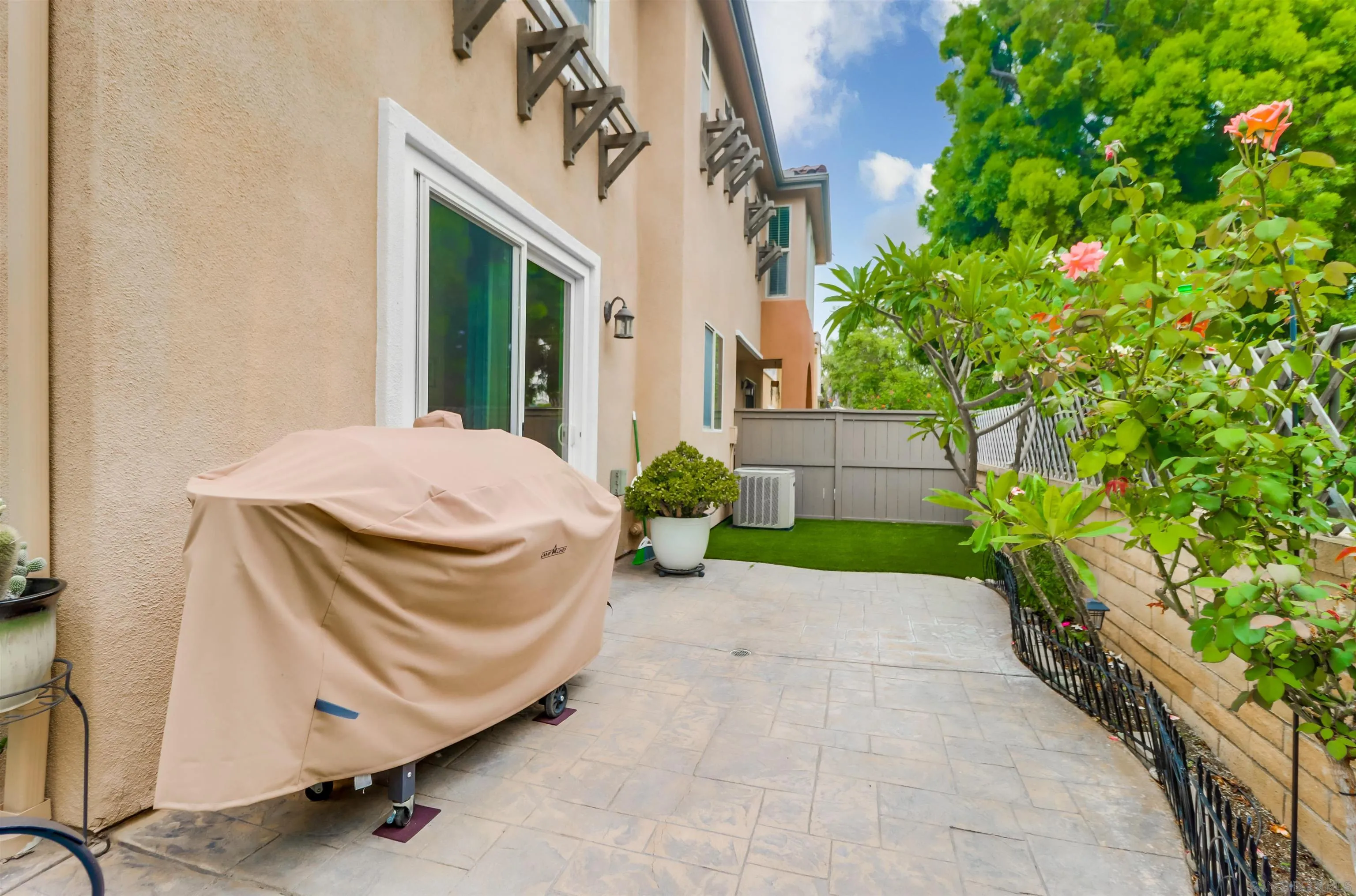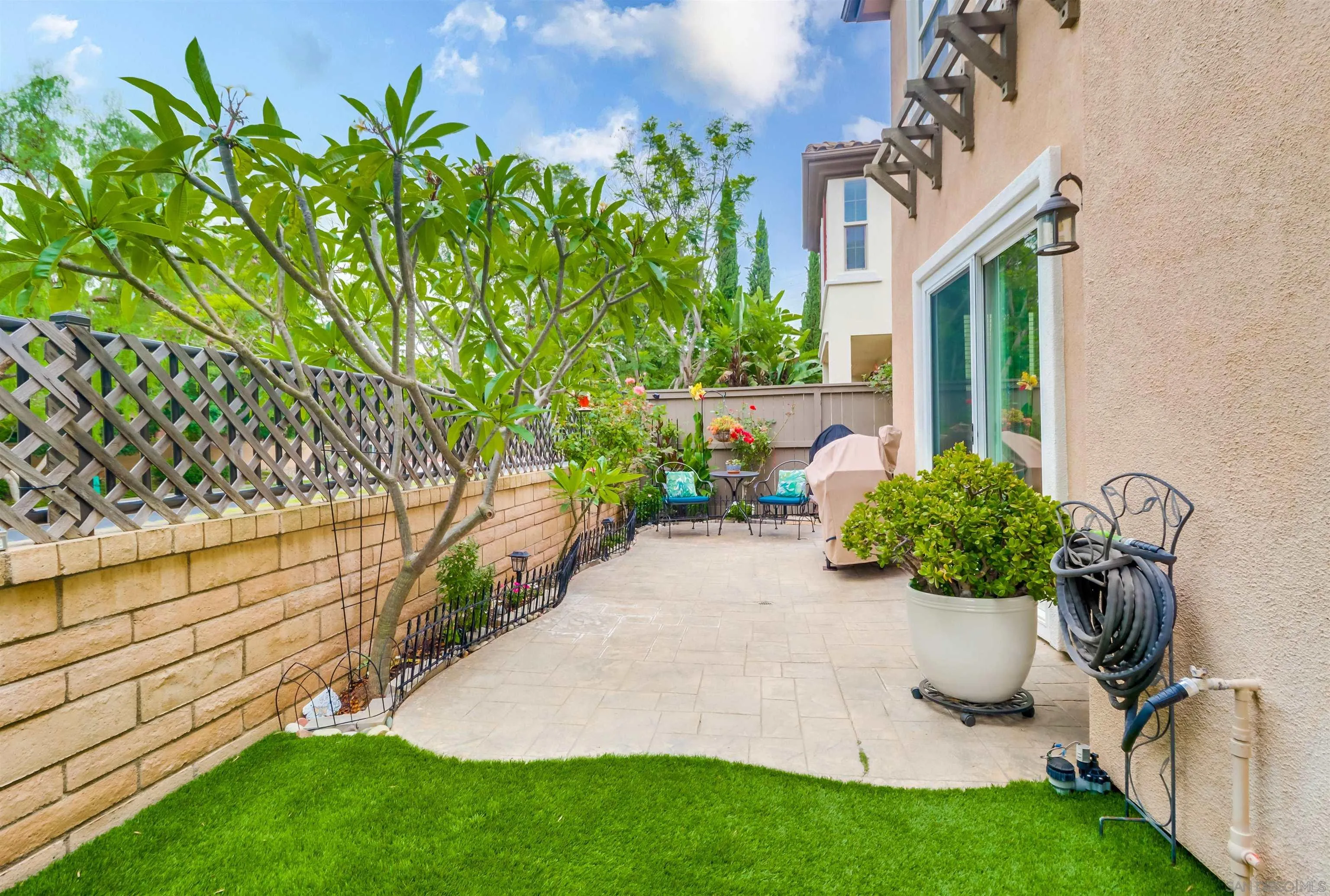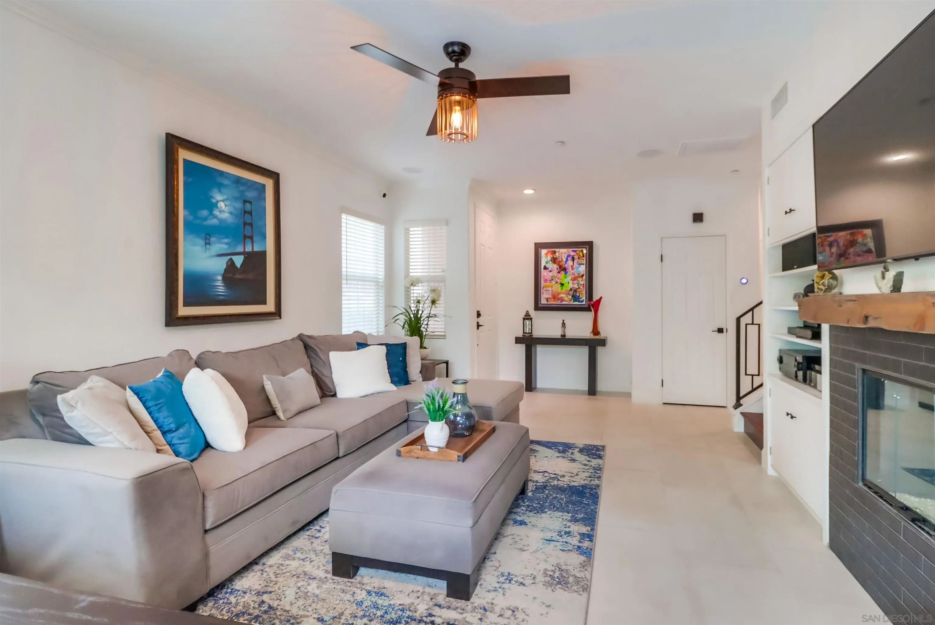 Upgraded & rare 2-story corner townhome in the highly sought after neighborhood of the Bungalows at Escala. This two bedroom gem offers luxurious living in every detail. Step inside to be greeted by an open floor plan with modern finishes throughout. The main level includes Italian Porcelain tile and features a gourmet kitchen with Whirlpool Gold stainless steel appliances, Brazilian Quartzite Fusion countertops, and an abundance of beautifully finished gray painted wood cabinets. The adjacent living room boasts a cozy custom surround fireplace, a sound system and provides access to a private yard with plenty of room for your fur baby to enjoy and an ideal space for indoor/outdoor living. A contemporary wrought-iron staircase leads you up to the second floor where you'll discover two primary suite sized bedrooms with ensuite upgraded baths. The largest bathroom provides a generous shower with dual shower heads including a ceiling mounted rain shower head. Additional highlights of this home include an under staircase retreat for your furry friend, hardwood floors on the stairs and second floor, upgraded designer lighting and fans, a convenient half-bath on the main level, and an attached 2-car garage with storage space. Escala is a gated community offering so much for residents to enjoy including two pools, spa, tennis/basketball courts, playground, dog park, gym, clubhouse with multi-purpose room for private events, trails, BBQ, onsite management and roaming 24 hr. security. Close to all - beaches, shopping, restaurants, entertainment, downtown, trolley and freeways.